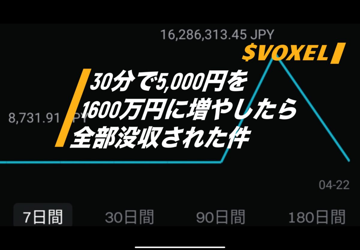 たまたま売買してた仮想通貨VOXELが、突然上下に激しく往復するような動きをし出し、嵌め込みだろうと思いながらも勝負してやろうと飛び込み、web3ゲーム『ラスメモ』で稼いだ5,000円が30分で1600万円以上になったが、市場操作による異常な取引に乗じた不正な利益として扱われ、アカウントが凍結された。